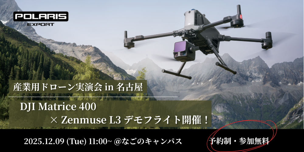 今回の目玉商品はDJI産業用ドローンMatrice 400+Zenmsue L3です。Zenmsue L3は11月4日発売したばかりの産業用LiDARカメラです。前機種のZenmsue L2より計測範囲は大幅アップ!当日は製品説明やデモフライトも行う予定です。また他の産業用機体の展示やマッピングソフトDJI Terraの説明も行う予定です。